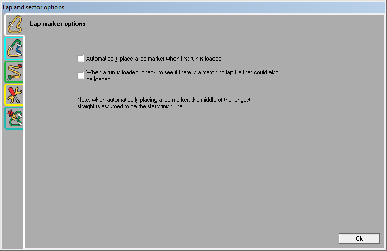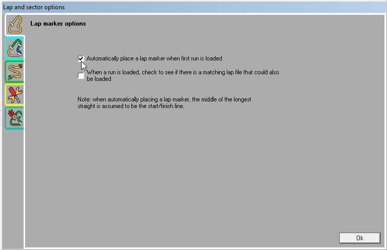In the Lap and Sector Options, there are three tabs. The Lap Marker Options Tab allows you to let the software add where the lap marker is and whether to let the software add the track marker when you load the .RUN file. Please note that the analysis software has no way to know for sure where the start/finish line is on the track, so if you ask to add a track marker the software simply places the lap marker in the middle of the longest straight section of the track based on the data that is loaded.