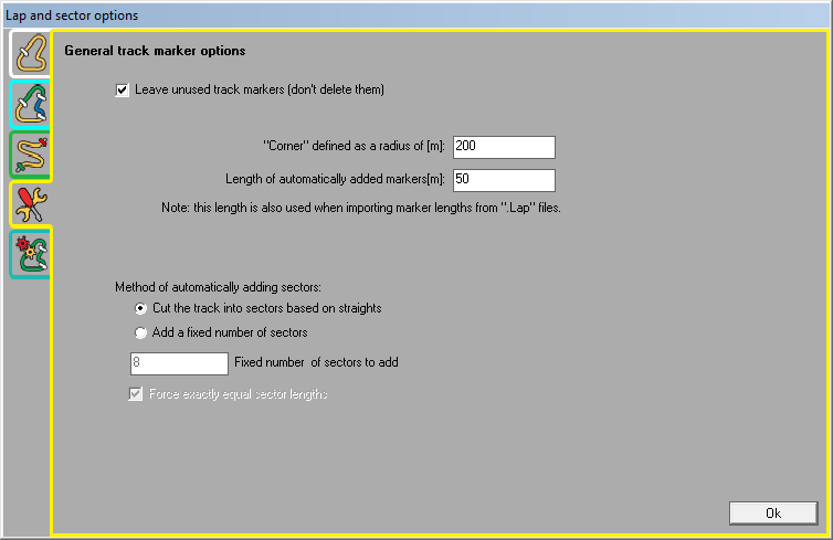 This tab allows you to define how the software adds the track markers. The sectors can be added based on 2 criteria. You can either split the track map into a fixed, predefined number of sectors, the software will attempt to place the sectors in an intelligent way. Alternatively you can automatically divide the track based on the straights and corners. The definition of a corner versus a straight is based on it's radius which in the example above is set to 200m - so for this example a corner is defined as a bend with a radius of less than 200m. From this window you can set the length of the track markers that are automatically added.