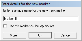 When you let go of the mouse button, you will be prompted with a dialog, asking you to name your track marker, and whether you want to use it as the lap marker. The first track marker you add doesn't have to be the Lap Marker, this can always be changed later.
