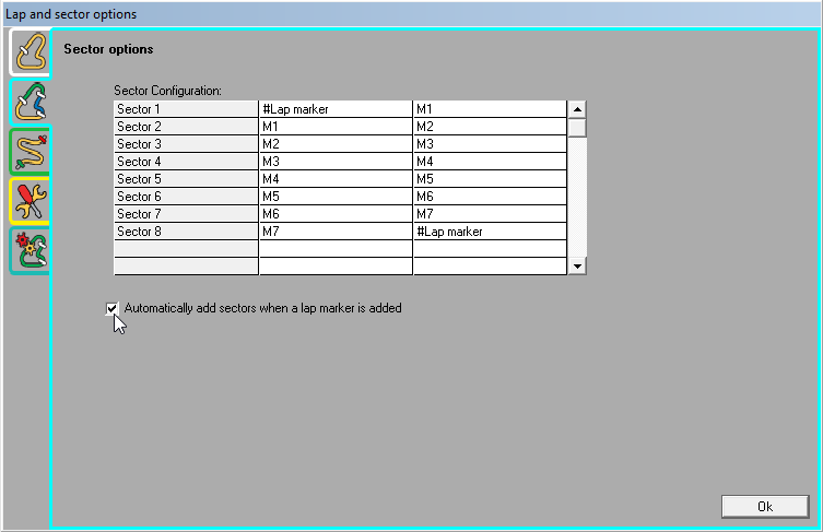 On the Sector Setup tab, you can add sector definitions, delete sector definitions and set whether it automatically adds sectors when you add a lap marker. (more settings as to how the software does this are on the "General track marker options" tab.)