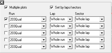 - Set by laps/sectors - When checked (default) it allows you to choose which portion of the plot is displayed, ranging from one sector to the entire run. To display singular sectors, you must first set up the Lap Marker and the sector markers, otherwise only the full run is available.