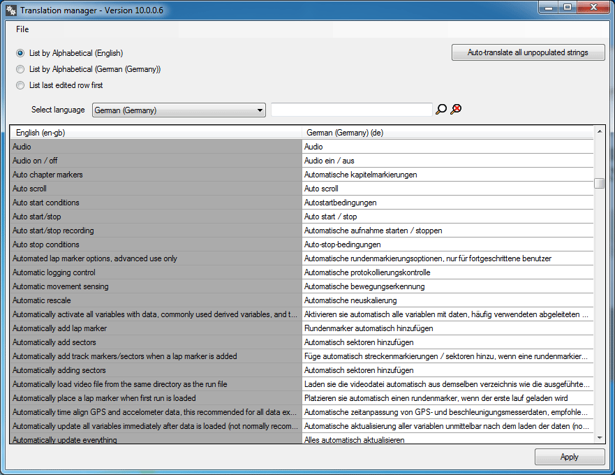 First column of the grid contains all English strings extracted from RT applications. This column is not editable.