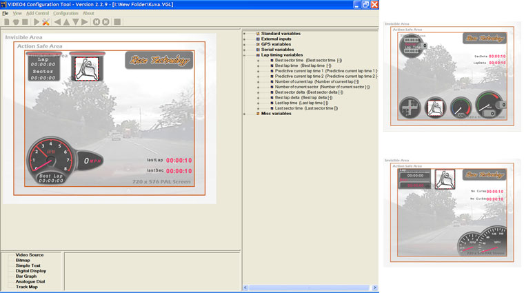 Users are able to create their own overlay design using the video sources and overlay objects in any combination using the RT VIDEO4 Configuration Tool. These objects can be assigned to RT Variable IDs which can control those objects dynamically (For example assigning SPEED variable to speedometer). The user can configure many settings using this tool including video format (NTSC or PAL), Video Bit rate, Recording Format (I, IP, IPB), Audio Volume, Chapter mark conditions and Brightness, Contrast, Saturation, Hue for each video input.