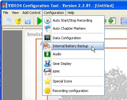 There is a configuration option in the “VIDEO4 Configuration Tool” that controls how long the internal battery runs the VIDEO4, this is under the “Configuration menu”, see below. This part of the configuration is saved along with all the other configured items when you write the VGL to the memory card and load it onto the VIDEO4 in the normal way.