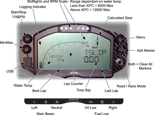 - RPM scale and shiftlights - scale 0-8000 when water <40oC/0-12000 when water >40oC