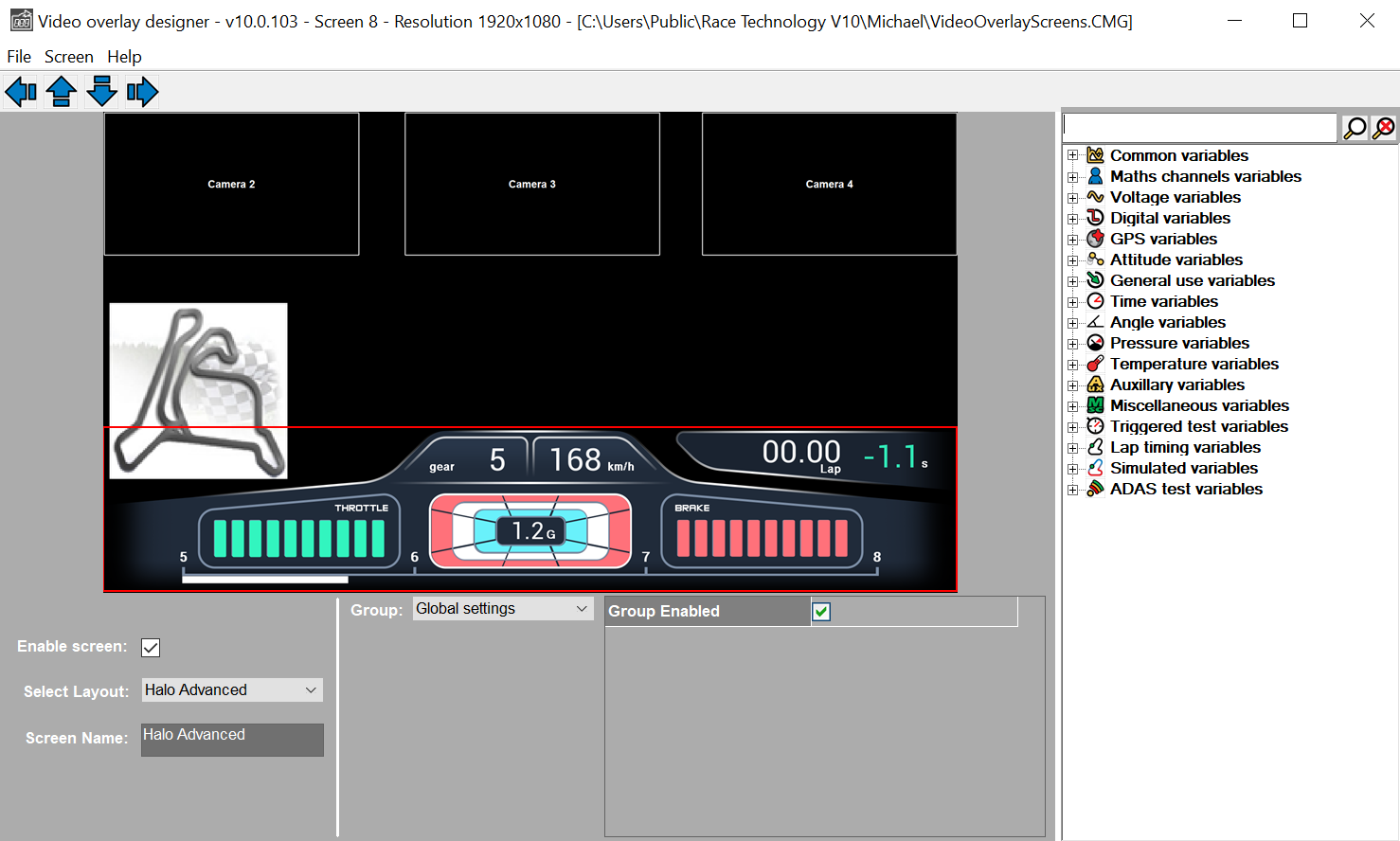 Video overlay designer let you choose overlays and assign them to screens. Screen is a container which can hold a copy of a data overlay file. You can name the screens; those names appear in the Analysis Video export dialog's "Select overlay" drop down list.