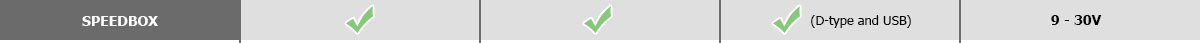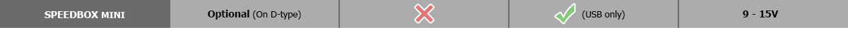 The SPEEDBOX MINI is more compact and lower cost. Analogue inputs are available on a D-type connector as an addition option. The second serial port is only available on the USB connector for viewing data on a PC.