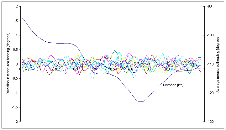 In this case the heading error is calculated as having a standard deviation of 0.013 degrees, however this is still an over estimate, as it not only includes the effects of heading error, but also: