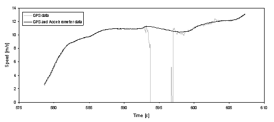 3. Combining the accelerometer data and the GPS data also has the effect of reducing the noise on the GPS speed signal whilst testing in imperfect GPS conditions. These imperfect conditions could be the result of driving past trees or intermittent lock from some satellites becoming obscured by buildings etc. The following example is very typical of data taken on a highway flanked by buildings. It is important to note that the speed data is not filtered in any way and there is no interpolation of the data, it is simply because the GPS and accelerometer data has been combined and the accelerometers have far lower noise – no dynamics are lost in the combining process.