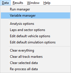Step 1: Load in your run to the analysis software and enter the "Variable Manager" option in the Data menu. Or click on the