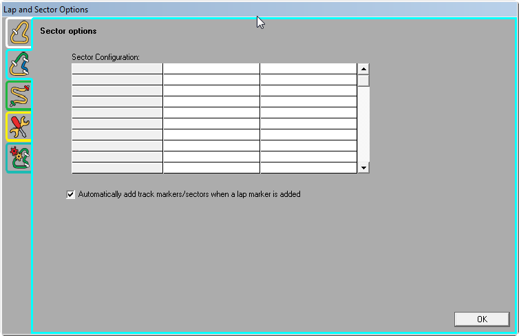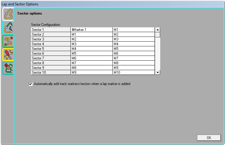 Select the option "Automatically add sectors when a lap marker is added" to let Analysis software add sectors.