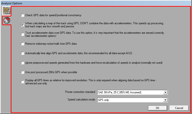 There are 2 ways for speeds to be calculated. In most cases the hardware stores GPS and accelerometer data, and the analysis software combines these to give speed. In some cases, noteably the SPEEDBOX, AX22, and optionally on the DL1PRO speed/distance is calculated in real time and stored. In most application the speeds that are calculated in real time are used in the analysis software, however if the unit was incorrectly installed or configured then it can be desireable to ignore the pre-calculated results and instead calculate them in the software from GPS and accelerometer data.