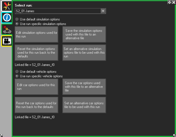 This tab allows user to set run specific vehicle options and simulation options for a run file selected from the drop down at the top. For a specific run, user can either choose to use the default options or set options only to affect that run.