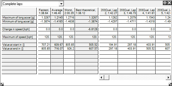 The best theoretical lap is used in both the calculation of the "Time Slip" and "Rate of Time Slip", as well as in the summary statistics. The best theoretical lap is calculated by taking the fastest "bits" of all the data currently loaded in to the program to get a single best possible lap that you could have driven. Note that whilst the "best theoretical lap" is used to calculate internal results, it is not possible to look at the data directly. However since the data is only an ensemble of parts of other runs, it is of course possible to look at the component parts if required.