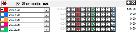 On the left are the selection boxes for the markers. If there is no tick on a row, then it will not be displayed. The rows are colour co-ordinated to match the colours of the markers displayed on the track maps and graphs. The drop down menu allows you to select which .RUN file you want the controls to play back. The gray coloured numbers to the left of the controls shows the current time for that marker.
