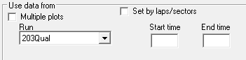 If you have more than one run loaded, you will be able to select it from the "Use data from" section. To choose the variable for the Y-Axis, select the variable you want to compare from the Variable Name list under the "Y axis configuration" section. To choose the variable from the X-Axis, choose the variable you wish to compare against from the Variable menu under "X axis configuration" section. To choose which part of the run you look at, make sure you have set up lap and track markers, then select which section you wish to look at from the drop down menus. Alternatively, if you've not got the lap and track markers set up, you can uncheck the "Set by laps/sectors" box and set which section of the entire run you look at by entering times into the boxes: