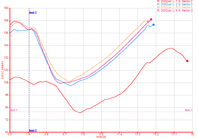 - Highlighted Data - This appears as a bold line for all the data selected elsewhere, i.e. a sector in the Lap And Sector Times table.