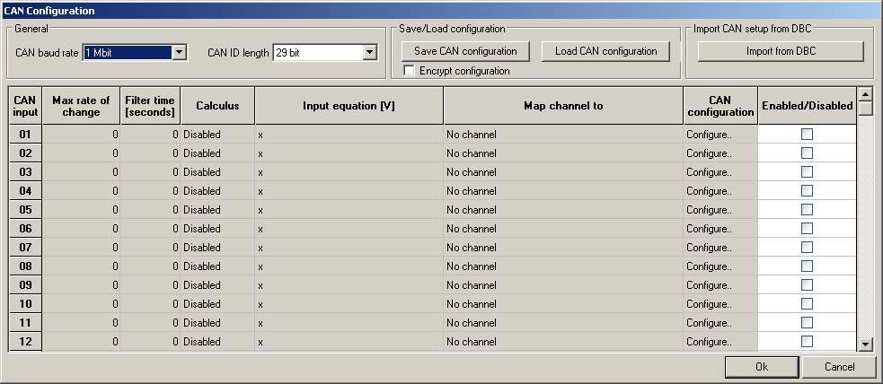 This is done from the main screen on the CAN configuration section. Basic settings for the CAN bus such as the identifier length (11 or 29 bit) and bit rate are also set here.