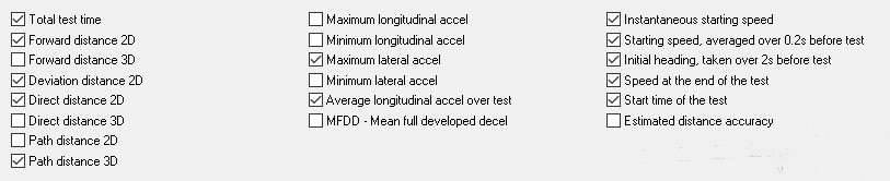/TestVariables:( [TotalTestTime]; [FwdDistance2D]; [FwdDisntance3D]; [DevDistance2D]; [DirectDistance2D]; [DirectDistance3D]; [PathDistance2D]; [PathDistance3D]; [MaxLongAccel]; [MinLongAccel]; [MaxLatAccel]; [MinLatAccel]; [AvgLongAccelOverTest]; [MFDD]; [InstStartSpeed]; [StartSpeedAvgOverBeforeTest]; [IntialHeadingTakenBeforeTest]; [EndOfTestSpeed]; [TestStartTime]; [EstDistanceAccuracy] )
