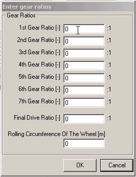 This allows you to enter the ratios, final drive, and rolling circumference of the wheel. If you click ok the table will be populated automatically based on these values. Note that once you click OK or cancel the gear ratio information is discarded - it will need to be re-entered in full if any changes need to be made to the gearing information.