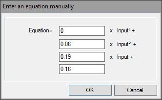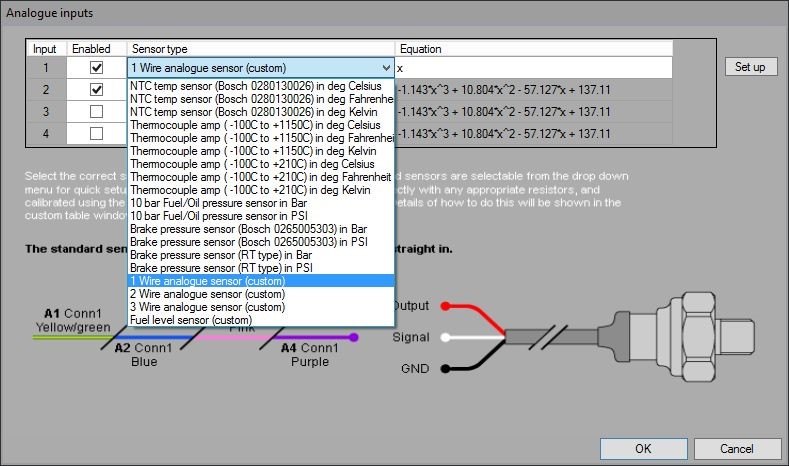 When the correct sensor type is selected the diagram at the bottom of the screen will change to show how the sensor is to be wired up. For the majority of sensors the equations are set up as default. Where the equation is to be entered manually, this can be done by clicking in the Equation box, which brings up a box to enter the equation values in to: