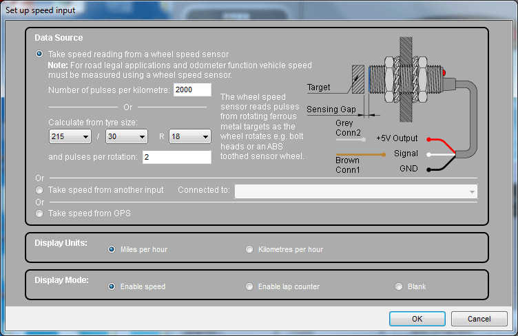 If using an external sensor the top option should be selected. The number of pulses per km can be entered manually or calculated by entering the tyre size and the number of pulses per revolution.