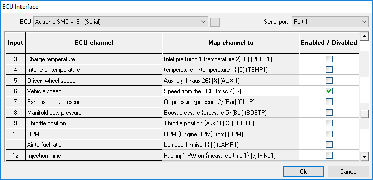 From the configuration software select the ECU Interface box and select the correct ECU from the drop down list. If the Vehicle Speed variable is supported it will show in the list. Tick to enable it: