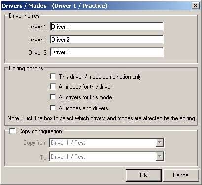 The nine different configurations are completely independent, so it is entirely possible to have changes from a simple difference such as the scaling used on the RPM scale, to changing everything including filtering on channels and what data is logged to the card or sent out of the serial port. During editing, options exist for setting the current changes to all drivers, all modes, or just one particular driver and mode. All of the driver options are set up from the DASH2 PRO configuration software. Open up the software and select Options / Drivers/Modes: