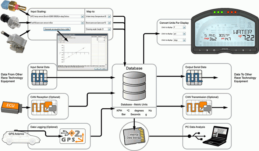 Note: the internal database uses metric units, and then converts them to alternative units for display. So if you intend to use different units (for example for different drivers having alternative unit preferences) it is recommended that you calibrate any inputs sensors/data as metric units.