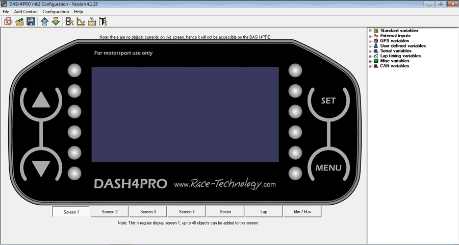 As part of the standard Race Technology software, we supply a comprehensive configuration utility for the DASH4PRO which allows the user to tailor the display to meet your exact requirements. You can use the software to configure the following features: