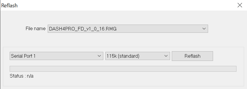 The firmware image file is now included with the Race Technology software package; it is not necessary to download it from the website. Once you download and install the latest software package, you can view the firmware version released with the DASH4PRO FD configuration program by opening the "Reflash" dialog (File -> Reflash).