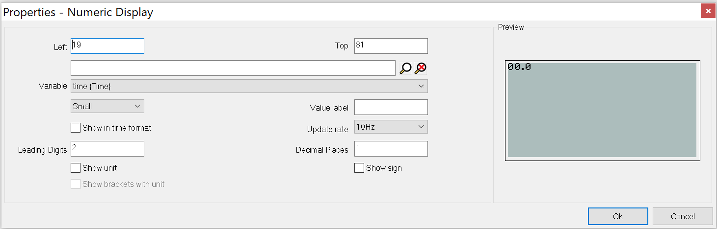 Selecting this option changes the display format of this control that is suitable for display timing information. When selected, Leading digits box changes to the Time format drop down list which contains several time formats. For the first three items in the list decimal places box is enabled and if you select the last item Lap/Sector time decimal places box will be disabled.