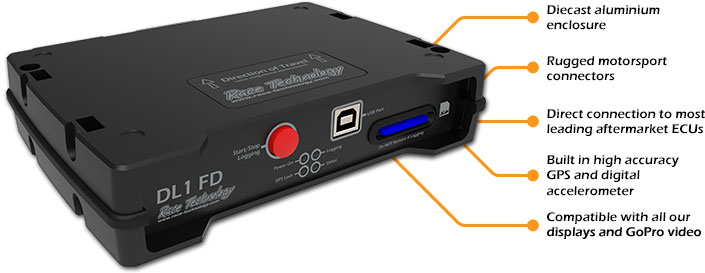 The DL1 FD is designed for autosport applications including drag racers, single seater racing cars, rally cars or road cars - however they also ideal for use on power boats, go karts and motorbikes. They are also an ideal platform for use in the auto industry for car testing of all types, from long term monitoring to competitor benchmarking.