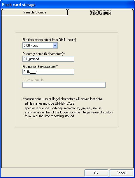 Flash card storage options for the DL1 CLUB determine which channels of data are logged to the memory card, as well as the naming of the files. These settings are selected from the Flash card storage icon on the DL1 CLUB configuration software: