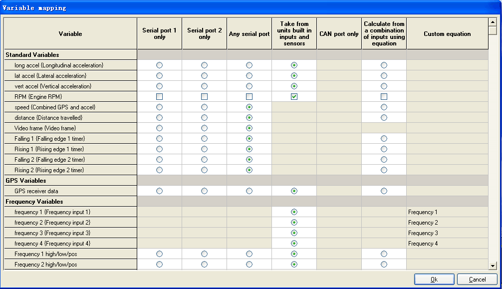 This is similar to the above scenario, most commonly with the RPM channel when it can come either from a serial adapter or from the internal sensor. In this case it is usual to have the RPM from the internal sensor as it will give a faster update rate and better response. So the RPM must be unticked for Any serial port.