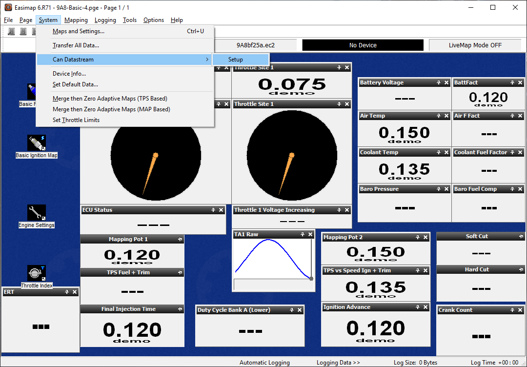 Load in your pre-made ECU map file. Alternatively read the map back from the ECU, to do this connect your ECU to the PC / laptop >>> power the ECU >>> on the mapping software select File >>> Load All Data From ECU.