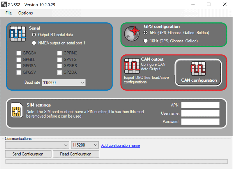 The GNSS2 is set up using a simple configuration software from a PC over the USB port