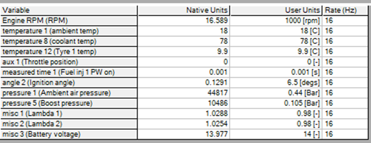 If everything is correct, ECU data will now be displayed like this. This is all the data available from the ECU. If you are seeing data like this you can now go ahead and configure the data shown.