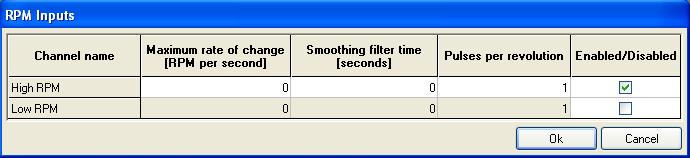 - Enable the High RPM input, set the number of pulses per revolution, depending on the ignition system you are using. If you are having issues with noise on the signal you can also set filtering for smoothing and maximum rate of change here.