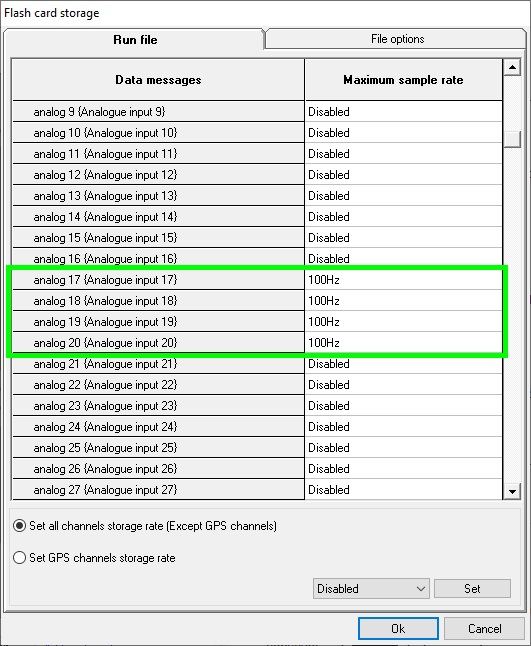 3) Open the Flash Card Storage section of the config tool & make sure that Analogue Inputs 17 - 20 are set to be logged at 100Hz: