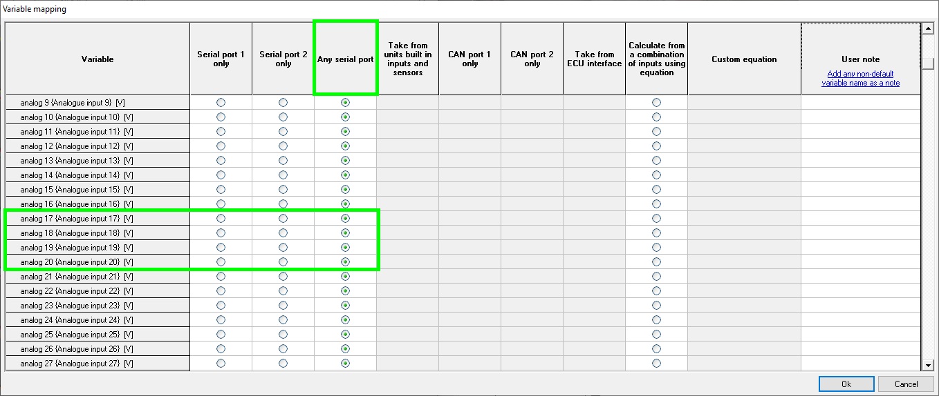 2) Open the Variable Mapping section of the config assistant & ensure that Analogue Inputs 17 - 20 are located in the Any Serial Port column: