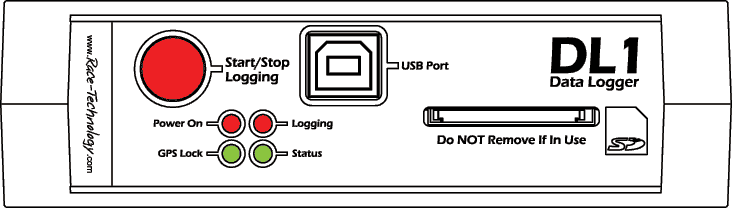 Press the Start/Stop Logging button on the front of the DL1 CLUB. The Logging light will now illuminate & the data logger will start logging data to the memory card. To stop logging data to the card, simply press the button again & the Logging light will not be illuminated anymore.