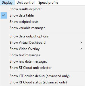- Data display windows (Virtual dashboard, Speed profile, Text messages, Raw messages, RT Cloud status)