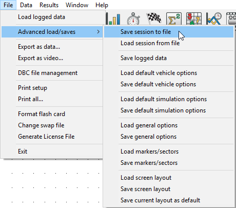 You can save an unfinished analysis working session in a file in the disk and do some analysis on another set of RUNs so that you could continue to work on the previous session again by loading that session from the saved file. These files are saved using the .RAF file format. The processed data is stored in the .RAF file along with many other information like the raw data for all loaded runs, configuration of the track map window and many more. For more information on what the .RAF file stores, click here.