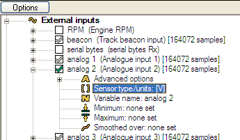How do I set up the analysis software to expect a particular sensor on an analogue input?