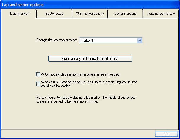 - Ticking the box "Automatically place a lap marker when first run is loaded" is a convenient option for fast track-side analysis. As soon as you load the first run file into the analysis software you will be given an option to automatically add a track marker, if the user responds "yes" then this is the direct equivalent of clicking the "Automatically add lap marker now" button, and a lap marker will be added to the straightest part of the track.