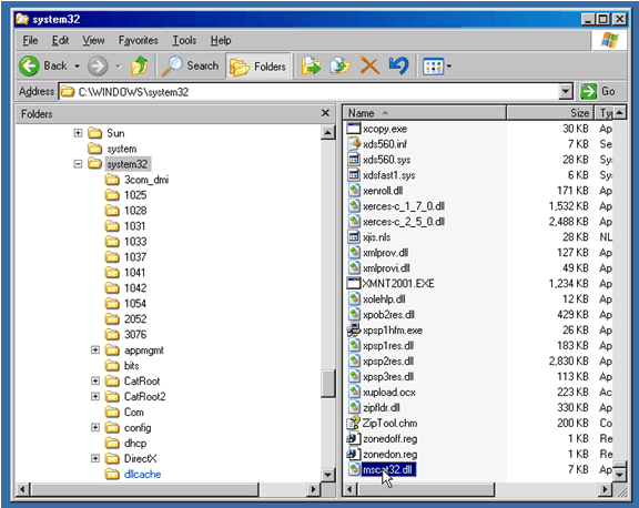 Step #3. Drag and drop the DLL into the directory as required, note that you must place a copy of the file into the directory – not just a shortcut to the file. In this example we have just dragged and dropped “mscat32.dll” from the desktop to the “C:\WINDOWS/system32” directory