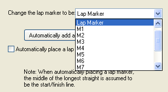 To set which marker is the Lap Marker, open up the Lap And Sector Options (Data ->Laps and Sector Options), and if you have your markers all ready in place, the drop down list will display the current Lap Marker and you can choose which you want to from the list, as shown below.