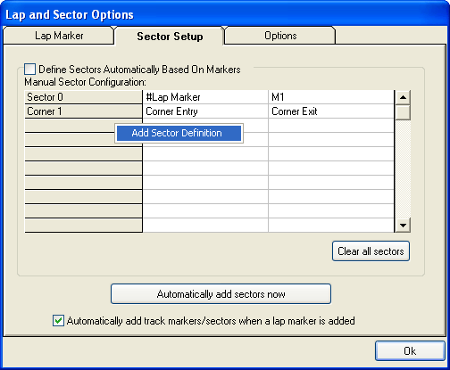 To define your sectors, open up the Lap And Sector Options and go to the Sector Setup tab. Under the Sector Configuration heading will be the currently existing sectors.