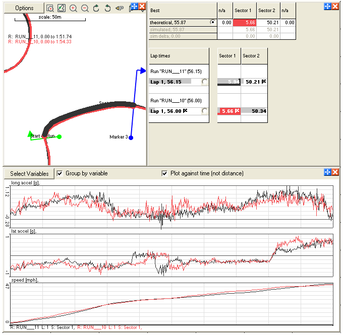 5. Once this is done then the start points of both data sets are lined up perfectly, overlaying the first sector from each of the runs they can be compared